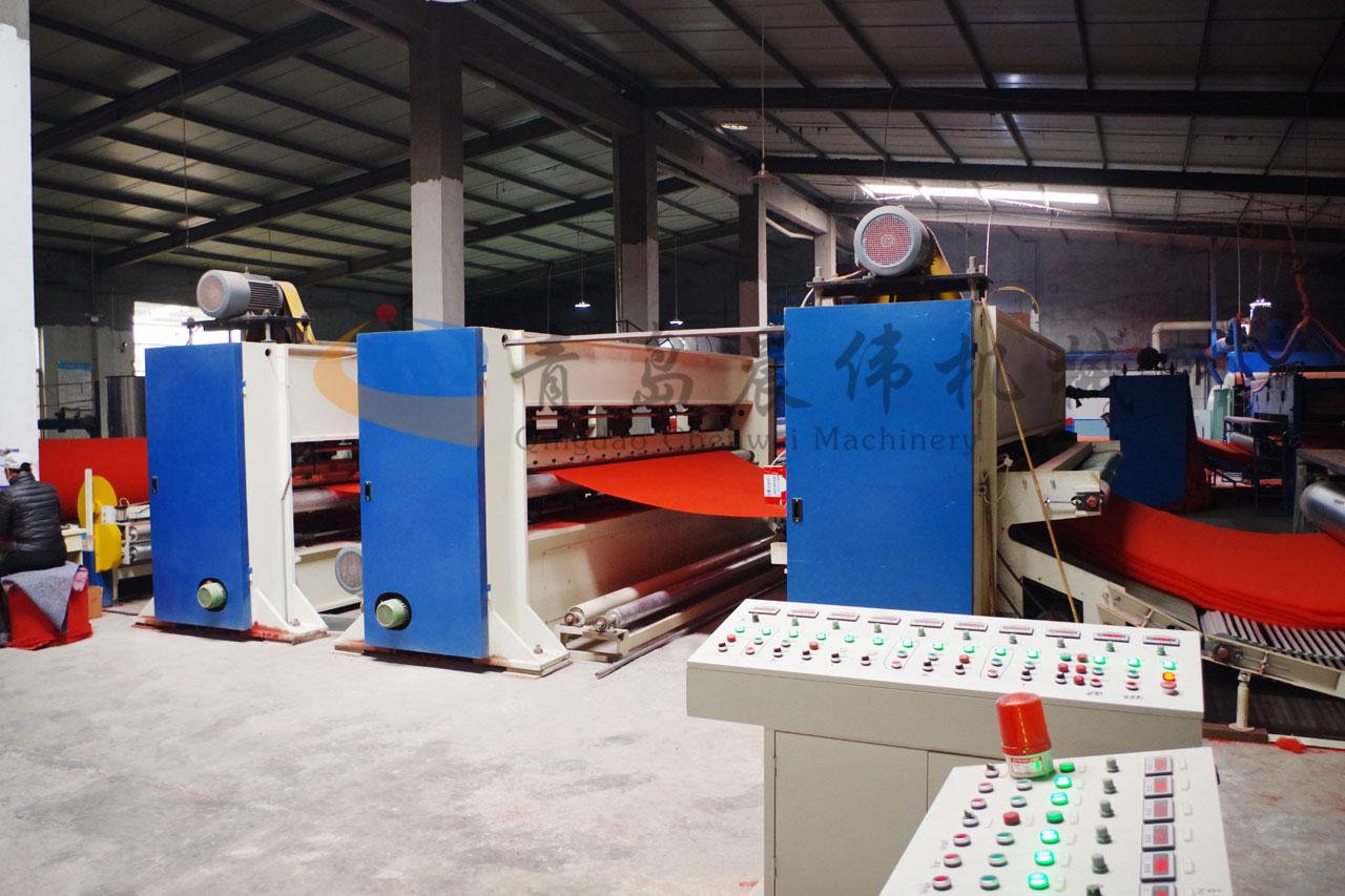 5. CWPW-鋪網(wǎng)機(jī):用于將梳理纖網(wǎng)通過移動小車交叉折疊為所需幅寬和定量的多層纖網(wǎng),以供后道工序使用。鋪網(wǎng)輥采用特殊結(jié)構(gòu),加裝壓網(wǎng)輥和導(dǎo)流板,不飄網(wǎng)不起皺,五只大功率電機(jī)精確控制各部件的運(yùn)動,電動輸出簾高度調(diào)節(jié)裝置