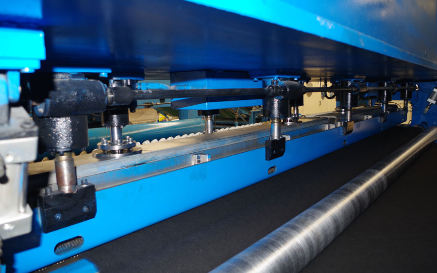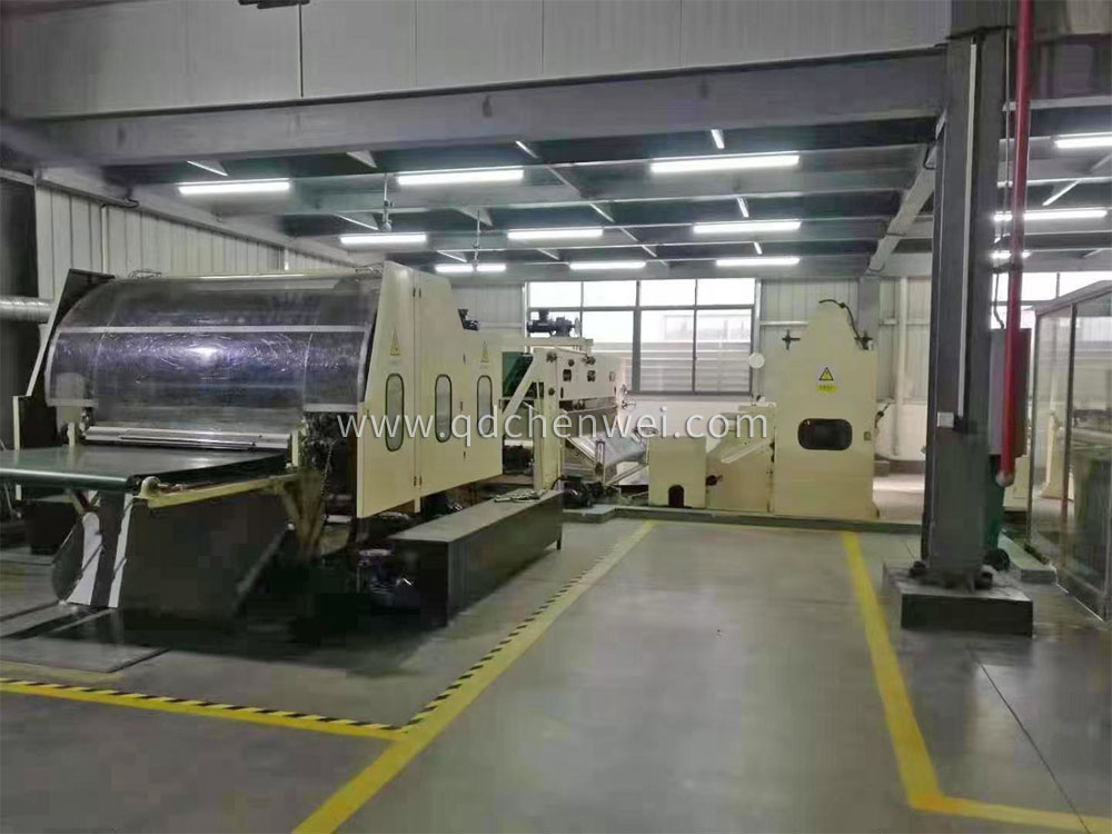 5. CWPW-鋪網(wǎng)機:用于將梳理纖網(wǎng)通過移動小車交叉折疊為所需幅寬和定量的多層纖網(wǎng),以供后道工序使用。鋪網(wǎng)輥采用特殊結(jié)構(gòu),加裝壓網(wǎng)輥和導流板,不飄網(wǎng)不起皺,五只大功率電機精確控制各部件的運動,電動輸出簾高度調(diào)節(jié)裝置