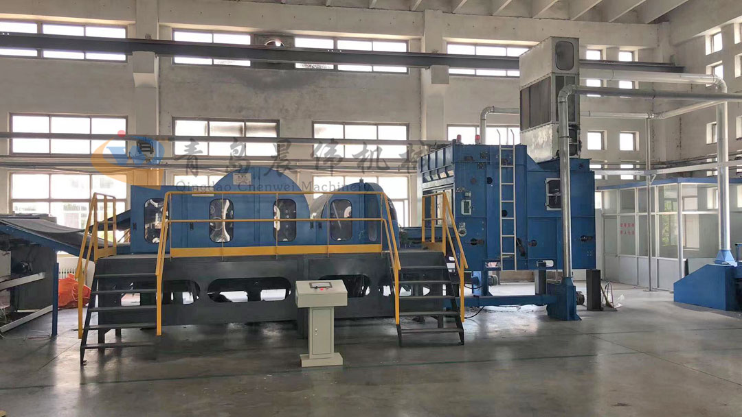 開包機(jī)-開松機(jī)-振動(dòng)給棉機(jī)-梳理機(jī)-鋪網(wǎng)機(jī)-烘房-切邊成卷機(jī)