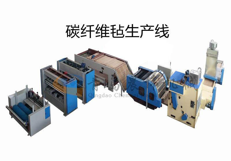 該設備機組主要用于碳纖維網(wǎng)胎層的制備。其工作原理是將短切碳纖維,通過均勻給棉、氣流梳理、鋪網(wǎng)、針刺、成卷等操作過程,制備出具有規(guī)定尺寸、克重和均勻度的網(wǎng)胎層。